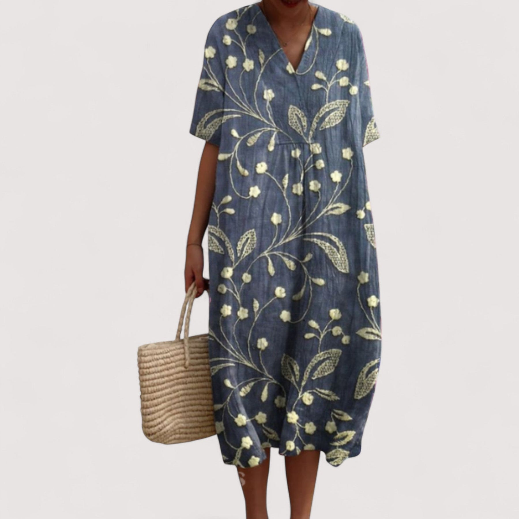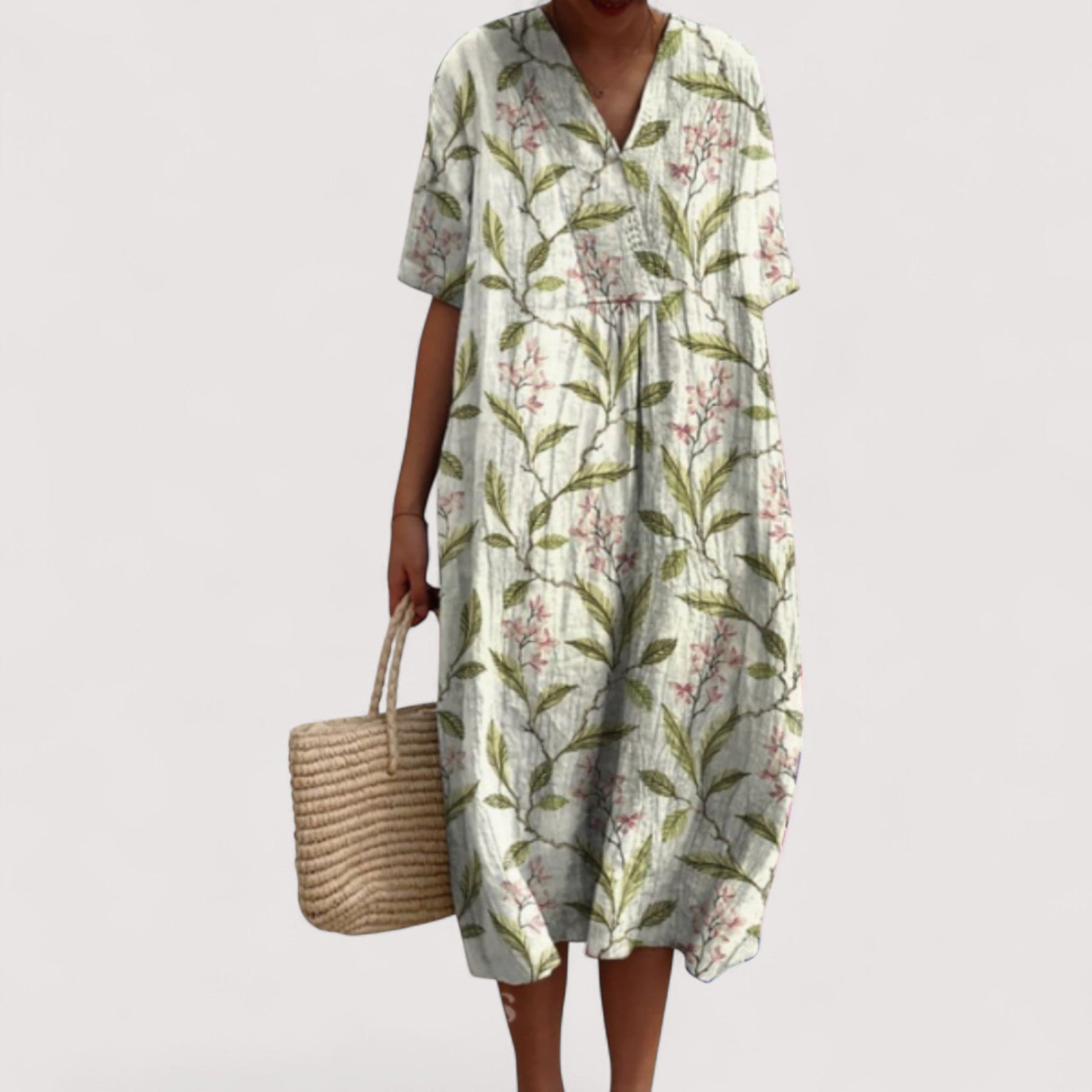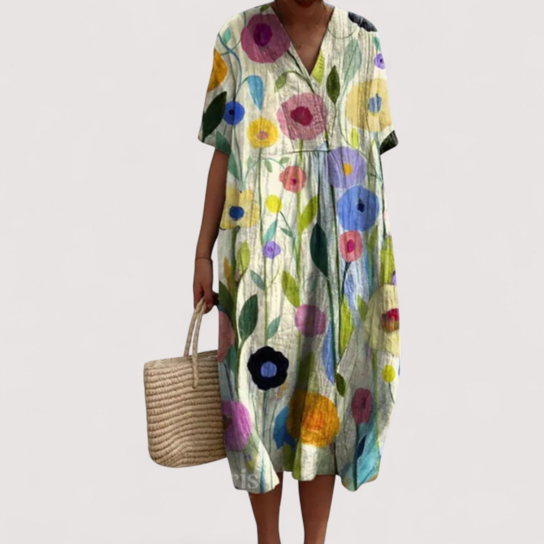 Umarmen Sie die entspannte Eleganz dieses Kleides mit fliessendem Schnitt und künstlerischem Muster. Es betont Ihre natürliche Schönheit, bietet mühelosen Komfort und Stil – ein essentielles Stück für einen kreativen Alltag.