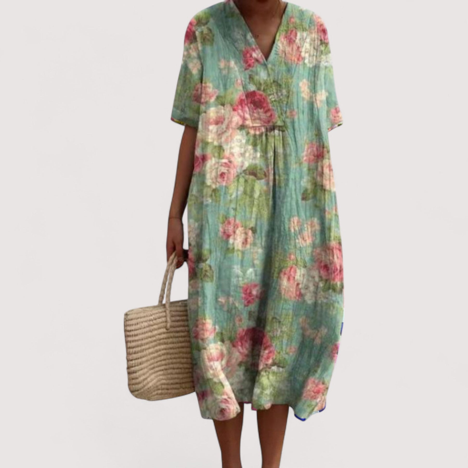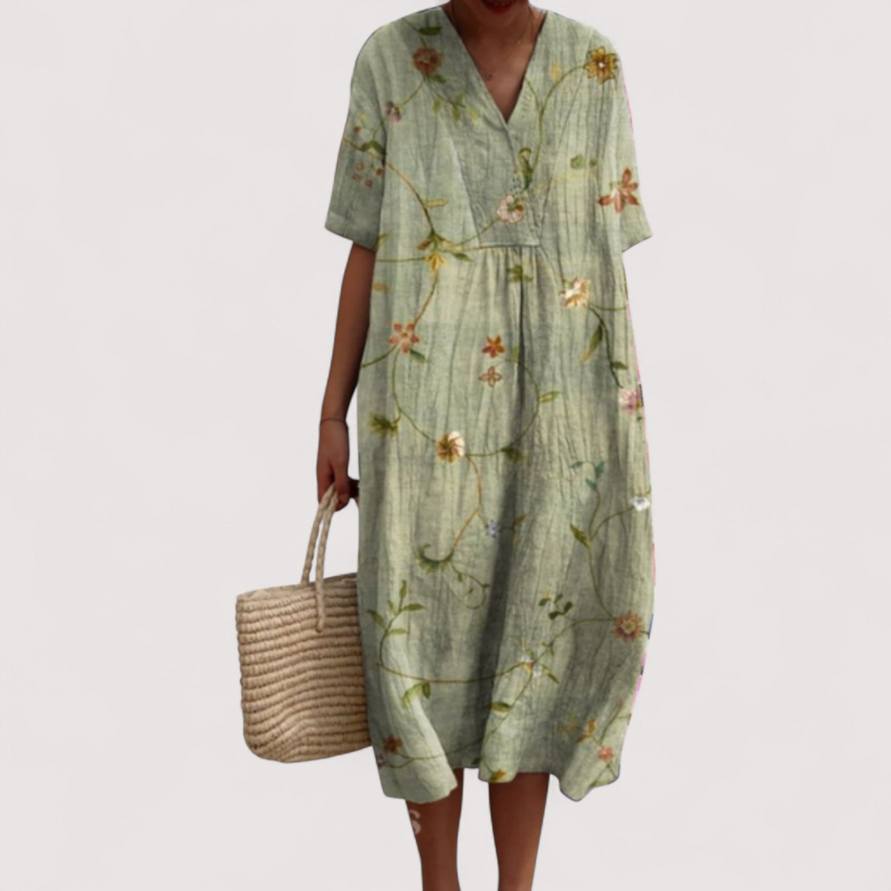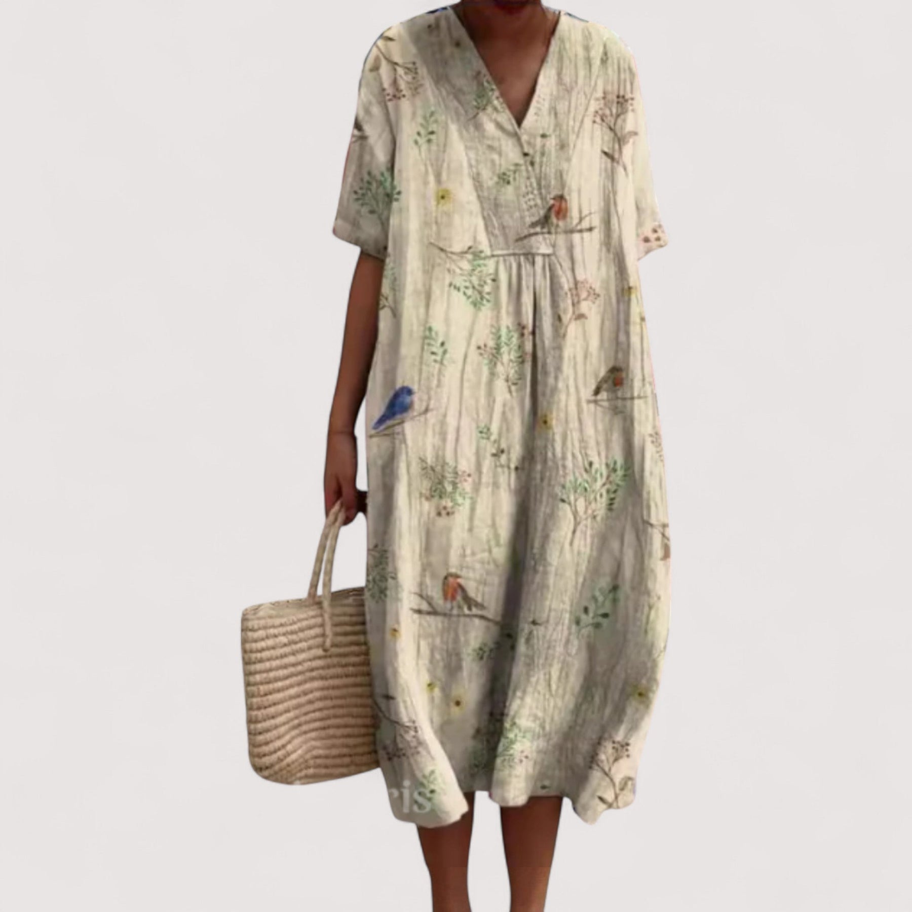 Umarmen Sie die entspannte Eleganz dieses Kleides mit fliessendem Schnitt und künstlerischem Muster. Es betont Ihre natürliche Schönheit, bietet mühelosen Komfort und Stil – ein essentielles Stück für einen kreativen Alltag.