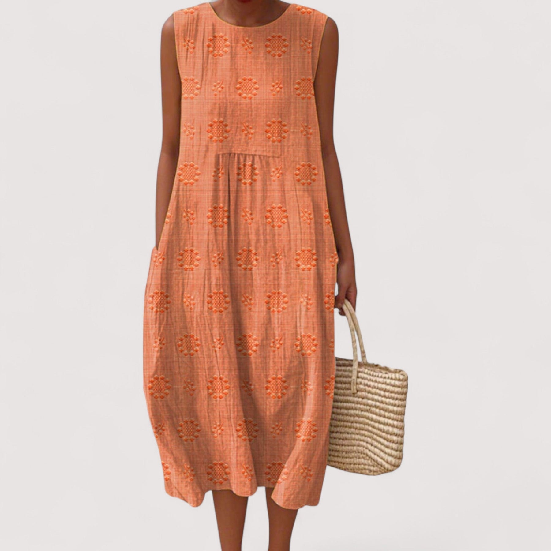 Ein luftiges, ärmelloses Kleid mit zartem Blumenmuster. Weich, feminin und perfekt, um warme Tage mit Leichtigkeit zu geniessen.