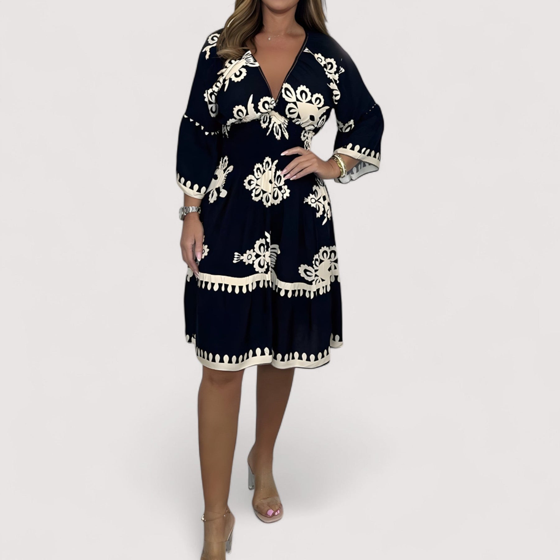 Heben Sie Ihren Alltagsstil mit diesem eleganten Kleid hervor, das Stickereien und eine schmeichelhafte Silhouette bietet. Perfekt für jede Gelegenheit, es ist ein zeitloses Stück, das Raffinesse und einen modernen Twist verbindet.