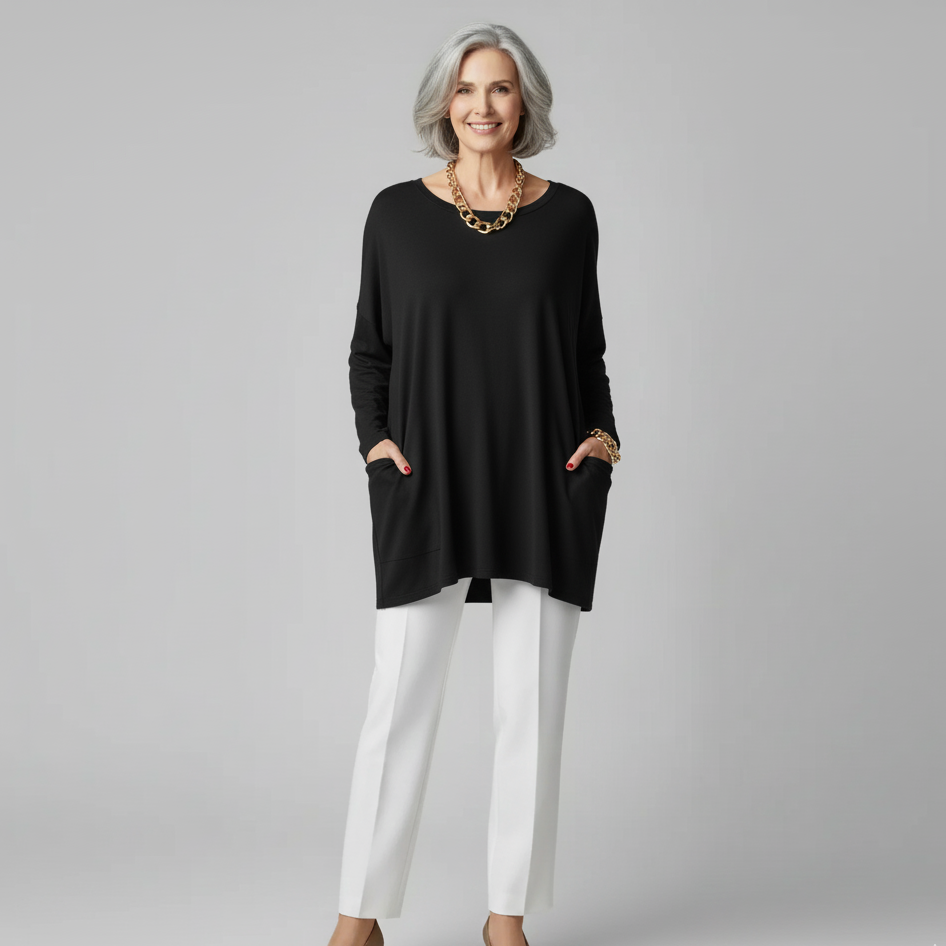 Dieses Shirt vereint mühelosen Stil mit sanftem Komfort – perfekt für Frauen, die Bewegungsfreiheit und Eleganz gleichermaßen schätzen. Der lockere Schnitt sorgt für eine fließende Silhouette, während die praktischen Taschen einen Hauch von Lässigkeit verleihen.